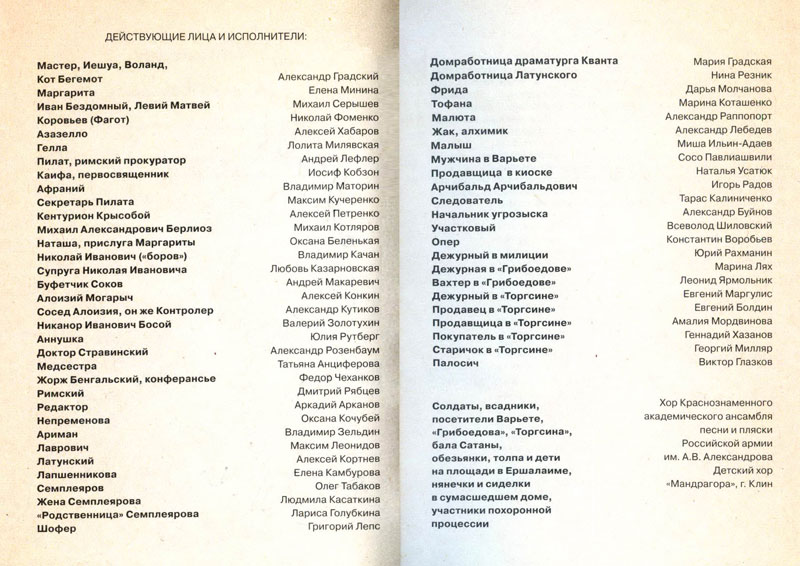 Звездный состав участников записи дает щедрую на творческие всходы почву. Кобзон-Каифа поет отрывистые фразы, так что не сразу узнаваем (что уже событие), но безупречен. Лолита-Гелла проказит так, что уже очень хочется увидеть эту Геллу на сцене. Фоменко-Коровьев вообще неузнаваем большую часть своих реплик, и по тембру больше всего напоминает Атаманшу из «Бременских музыкантов».