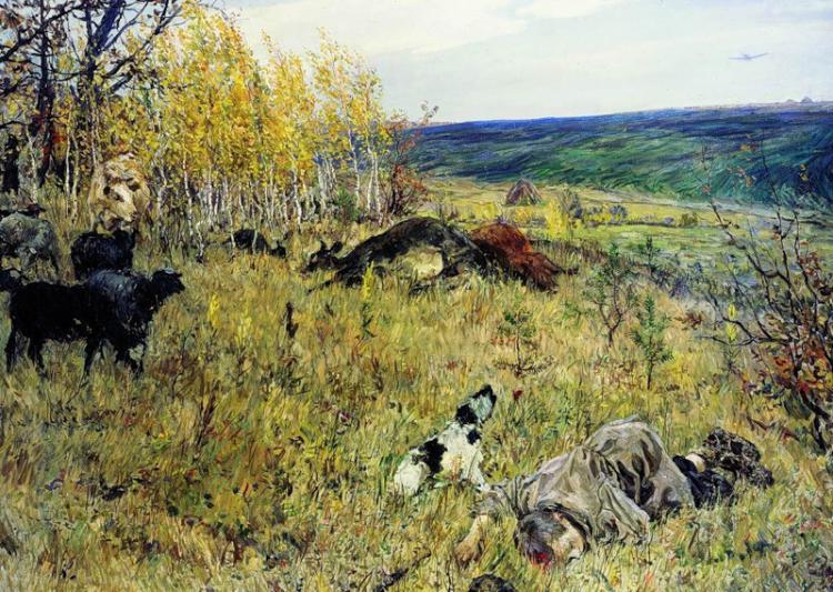 Восьмиклассникам столичной школы учительница показывает картину А.Пластова "Фашист пролетел".