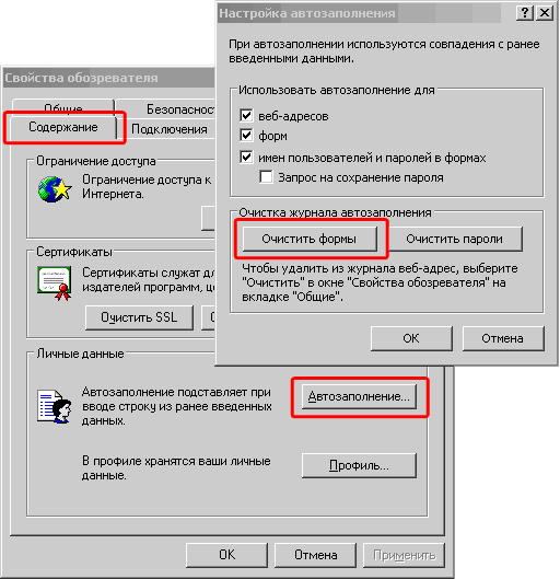 Автозаполнение в формах вычищается следующим образом. Explorer. Меню "Сервис", пункт "Свойства обозревателя...", закладка "Содержание", кнопка "Автозаполнение" в "Личных данных".