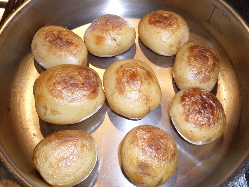 Небольшие клубни молодого картофеля тщательно моются и просущиваются. На сковороде с небольшим количеством оливкового масла клубни (нечищенные) подрумяниваются. Сковорода помещается в духовку при 200 град.С на 30-40 мин.