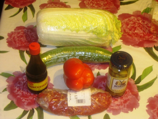 навеянно соседней веткой. Что нужно? Нужны средства, на которые надо купить слейдущие составные части 1. Ворчестерский соус (Worcestershire sauce)без него не стоити пробовать 2. около 300 гр. говяжей вырезки 3. маленький кочанчик пекинской капусты 4. оливки без косточек 5. свежие огурец и паприку
