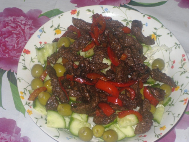 Говядина режитьсмя полосками, как картофель фри и слегка поливается Ворчестерским соусом. Затем полоски говядины на небольшом огне жаряться около 30 минут. Пока жариться говядина, можно порезать пекинскую капусту, огруцы и паприку, добавить оливки. Прожарив говядины, она добавляется в салат и сверху добавлаяеься еще немного капель Ворчестерского соуса и перемешивается. Лучше есть, пока говядина теплая.