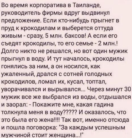 Перед свадьбой мать учит дочку: -В женщине всегда должна оставаться для мужчины какая-то загадка, тайна. Когда будешь ложиться в постель с мужем, ниогда не снимай с себя все до конца! Через 10 лет брака муж в постели спрашивает: -Скажи, а у тебя в роду никогда ненормальных не было? -Нет, а что? -Для меня до сих пор загадка, почему ты всегда ложишься спать в сапогах?