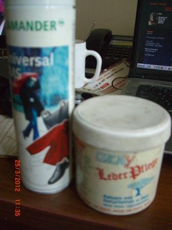я в Германии купила две фигни. Спрей- это просто уход, причем и кожа и нубук. А баночка рядом- купила очень давно,лет 5 назад и больше в продаже не видела. Это натуральные жиры, скорее всего как раз гусиный. Рекомендуется просто не лениться, каждый раз, приходя домой, мыть сапоги в ванной, протирать тряпочкой, а затем наносить толстым слоем этот жир. Складывая в коробку на лето, особенно тщательно протирать, иначе к наступлению следующего сезона обнаружишь пропавшие сапоги Реагент проникает в кожу незаметно и делает свое пагубное дело, когда сапоги уже дома и в тепле.
