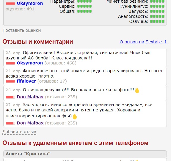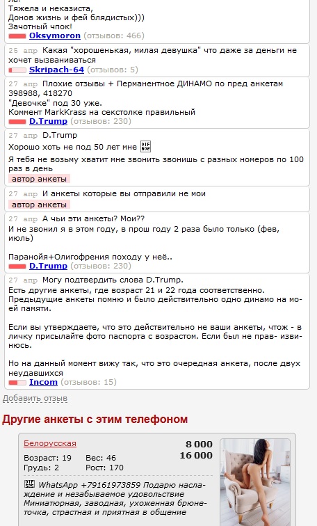 На КЛС и на ИС разная политика и разные правила. Феи на ИС имеют больше рычагов влияния на ходоков (сами знаете какие), как это не печально для нас, но это факт! Ресурс коммерческий и зарабатывает деньги на них, а не на нас. Поэтому при рассмотрении жалоб, верят как правило им. Если не верите, могу рассказать в личку, как и за что банили некоторых уважаемых Донов! D.Tramp в данном случае даже не был у фее, а утверждает, что ей 27лет, хотя по фото она выглядит на свои 19. Это легко проверяется админом ИС, скинет скан паспорта с датой рождения, по его запросу. Назвал её "ОЛИГОФРЕНКА", какое имел право на это!? Как говорится: "за базаром надо следить!". По поводу динамо, есть фейс-контроль и это её право принимать его или нет и это не повод чтобы через год таким образом мстить фее. Ещё, в комментариях она утверждает, что ссылки на анкеты, которые он дал,- это не её анкеты, админу это тоже легко проверить..и если жалоба автора анкеты подтвердится, тот кто её оклеветал будет иметь бледный вид! И ещё раз повторяю, сами феи к составлению анкет, в большинстве случаев, отношения не имеют! А на вранье я его уже ловил в его предыдущих отчётах: http://sextalk.ru/showthreaded.php?Cat=0&Number=2972708&an=0&page=0#2972708