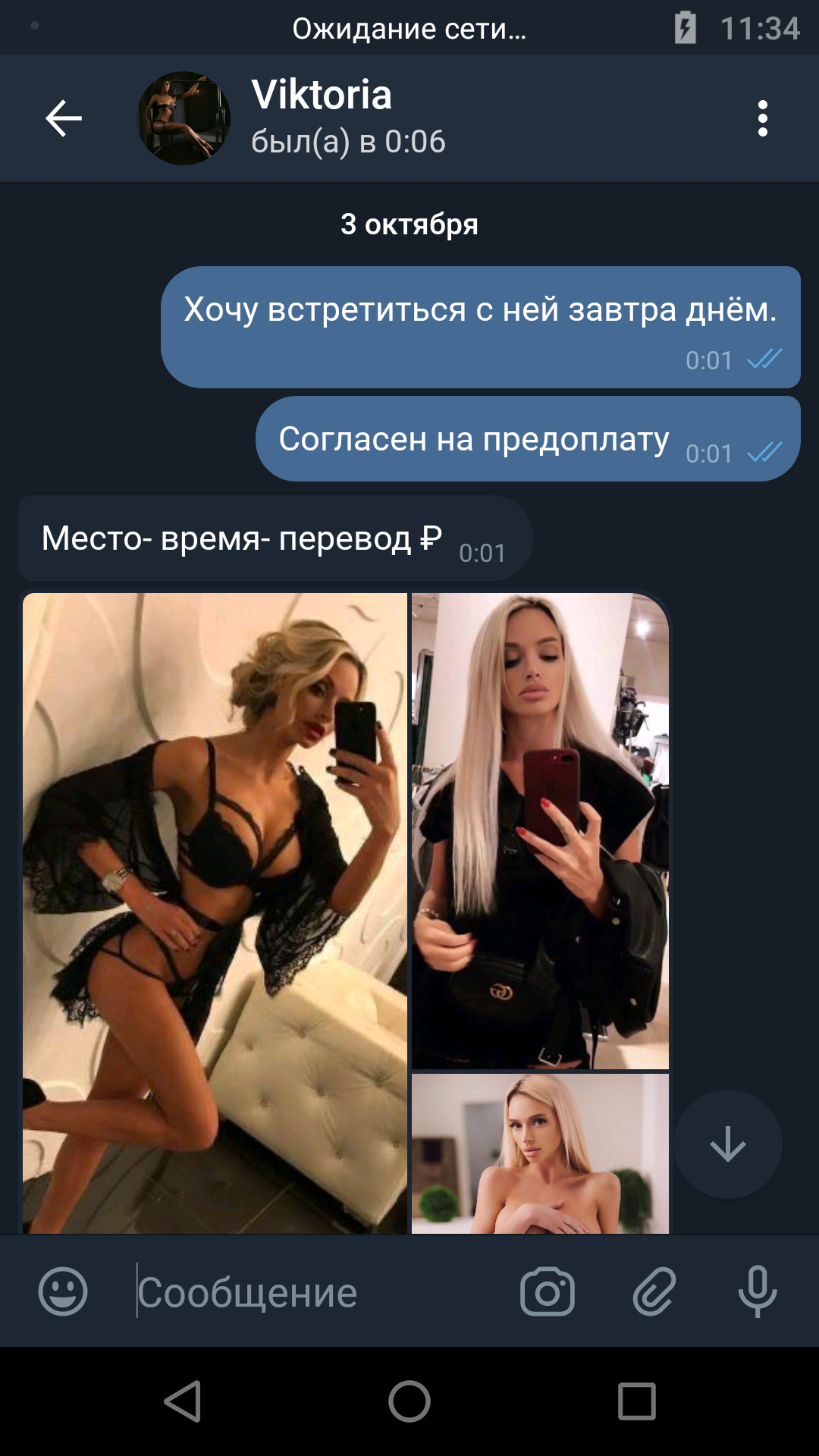Для тех, кто не хочет рассматривать картинки сразу расскажу, чем все закончилось - через пять минут после перевода предоплаты выяснилось, что в этот день девочка занята и мне была предложена другая, после того как я не согласился на замену и несколько раз потребовал вернуть деньги меня забанили во всех мессенджерах.