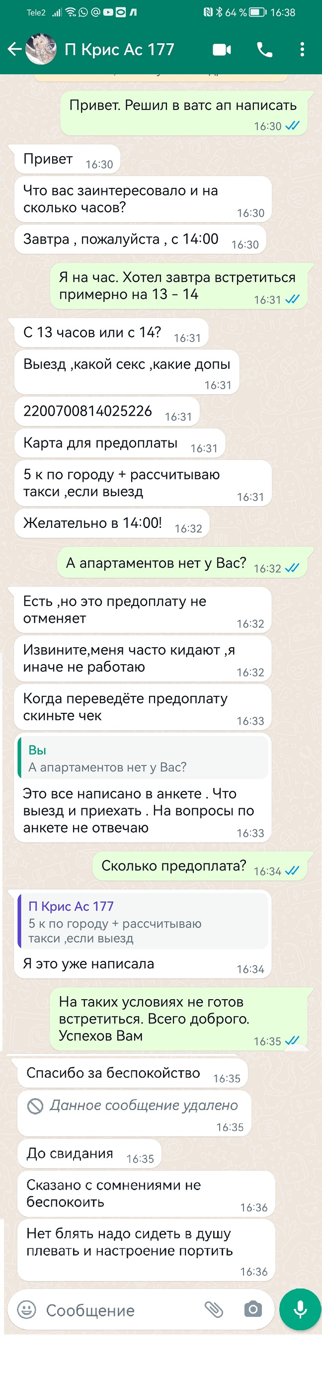 Доброго времени. Ну не отчет. А так, заметка. Про полный неадекват в общении. Приметил молодую ,стройную, высокую, анальщицу. Хочу на завтра спланировать свой визит к ней. Написал в месенджер. Вот , что из этого получилось на фото. Там где сообщение удаленно. Она написала "пошел на хуй" и через 50 секунд удалила. про предоплату у нее в анкете ни слова.