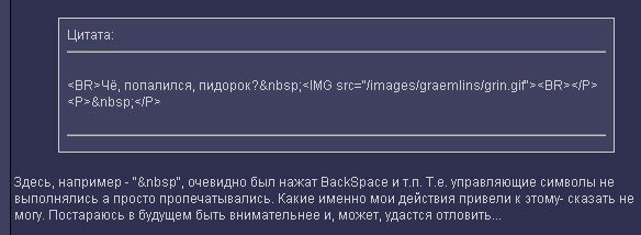 Кажется, у меня мысль проскочила, устойчивое ощущение, что у меня это всегда возникало... только не смеяться .....в ГУ (ну у них там все через жопу ). И до сих пор такая фигня висит в этом посте.Но он залочен. Если разлочите прям щас, то войду в окно редактирования и сделаю, то, что вы просили. ХОП-П-ПА - А ТАМ УЖЕ ВСЮ ВЕТКУ СНЕСЛИ....