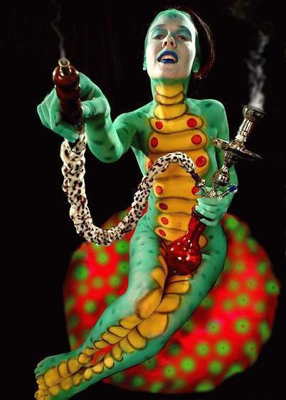 Гусеница лежала на шляпке огромного гриба, и была просто огромная. - Добрый день! - промолвила Алиса. - Кто… Ты… - протяжно произнесла гусеница. Гусеница курила большую трубку. Выпуская с каждым, словом клубы дыма. Сладкие и мохнатые они поднимались вверх, завиваясь и путаясь сами в себе, уносимые легким теплым ветерком. «А может мне тоже покурить» - подумала Алиса… … И больше она не думала не о злобной и гламурной королеве, не о слабохарактерном мазохисте короле, не о мажоре шапочнике с его маргинальным кроликом, не даже об эротичной улыбке старого чеширского педофила… ОНА ВООБЩЕ БОЛЬШЕ НИ О ЧЕМ НЕ ДУМАЛА… …До самого утра… …пока не проснулась… …от нестерпимой головной боли… …в луже собственной блевотины… …в однокомнатной квартирке… …на окраине Салтовского жилмассива… …Рядом лежал забычкованный в меховом тапке косяк… и книжка «Алиса в зазеркалье», заложенная в самой середине уже ставшим подсыхать куском салями…