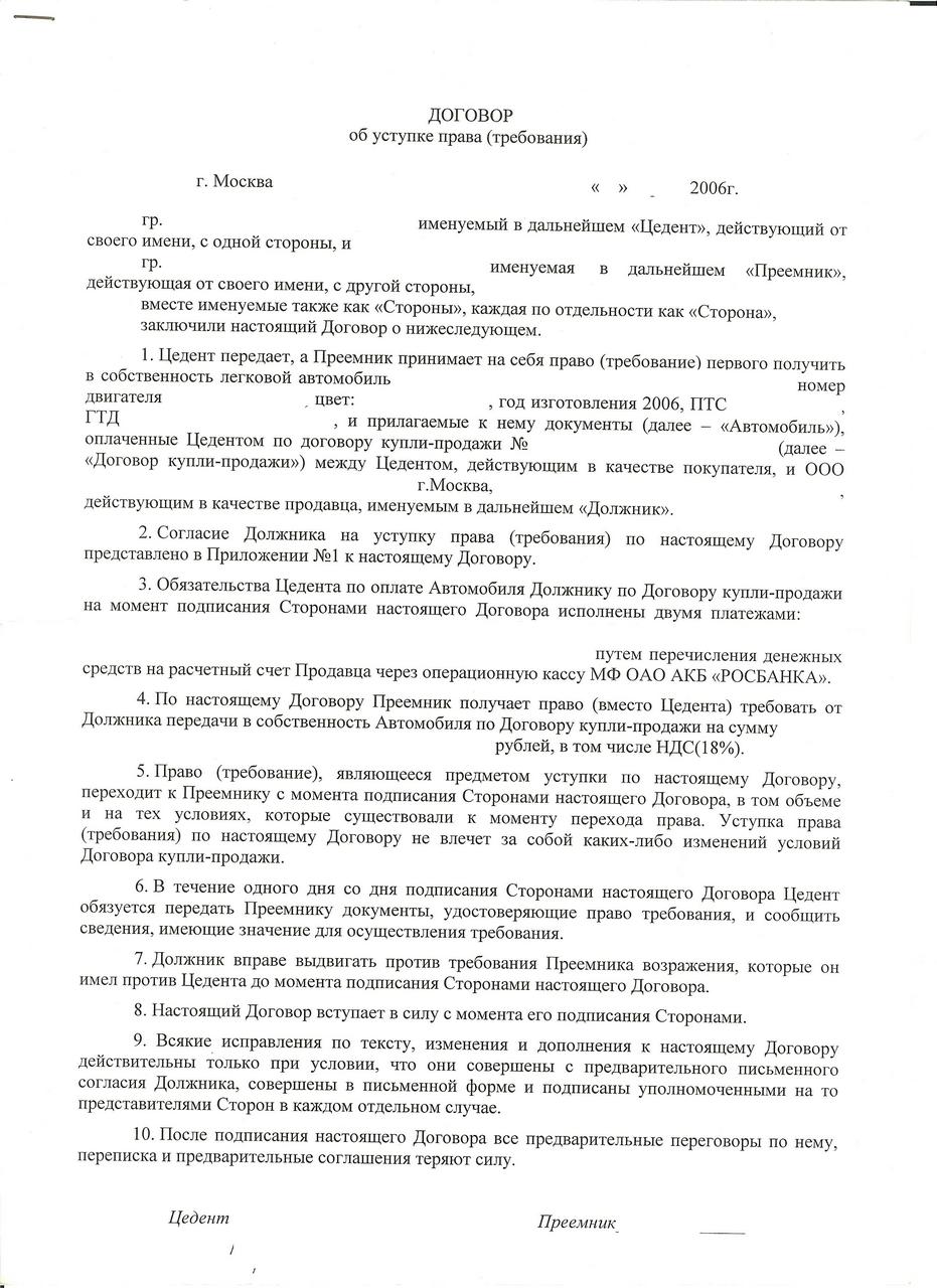Так получилось, что за автомобиль платил я, а оформлялся он на жену. В браке на тот момент мы не состояли. Поэтому при выдаче авто в салоне был составлен "ДОГОВОР об уступке права (требования)". В этом договоре я был обозван страшным словом "Цедент" а жена поименована практически как Медвед - "Преемник" Сам договор приложен в аттаче.