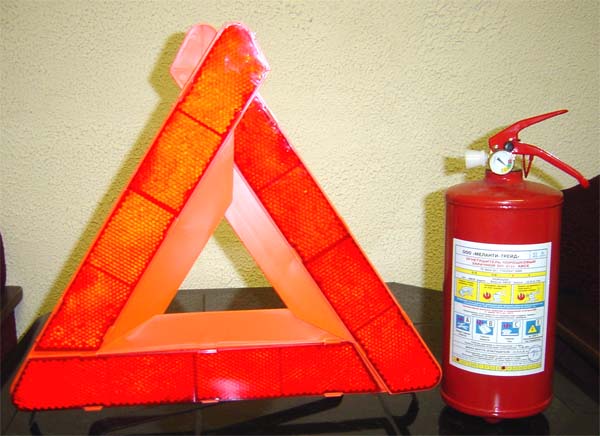 Четверг. По дороге заезжаю в автосалон в приятелю и беру у него на пару дней в аренду "Дорожный комплнект автомобилиста", который они кладут во все новые машины. Там аптечка, могучий 2х-литровый огнетушитель и аварийный знак какого-то там "нового образца". В чем эта "новизна" - я так и не понял, но на всякий случай привожу здесь фотографию этого знака и огнетушителя, так как именно они являлись объектом самого пристального внимания гиббона