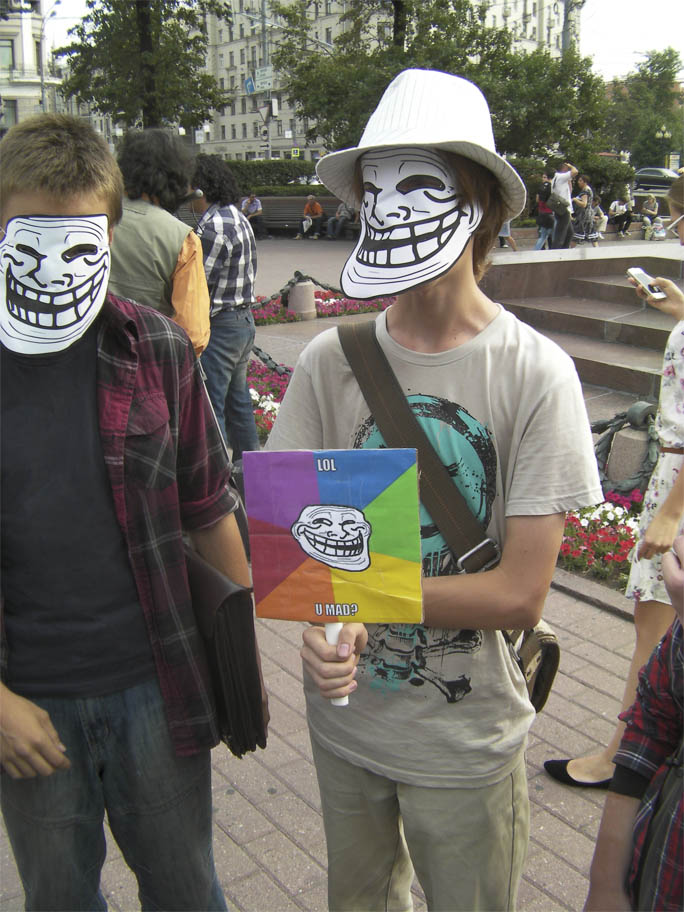 Потом со стороны зрителей подошли геи в масках (см. фото) и стали скандировать "Я за новенький АйПад что угодно порвать рад! Хоть за Путина, хоть за Агутина!" Корреспонденты с надеждой кинулись к ним - может, хоть что-нибудь порвут. А мне всё это наскучило, и я пошёл домой.