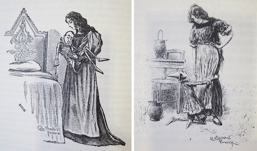 Для снижения драматического пафоса обсуждаемой темы (из пальца она высосана или из иного) предлагаю взору читающих две иллюстрации итальянского художника Carlo Chiostri (он работал с первым изданием 1883). На ней изображены Пиноккио и фея (у нас Буратино и Мальвина). Видно, что фея - не девочка. Вопреки реальному тексту эту композицию буду трактовать предельно пошло. Справа П. упрашивает фею (она объявила себя его матерью) отдаться ему для компенсации того, что он испытал при общении со своим "отцом" и одним бородатым продюсером.