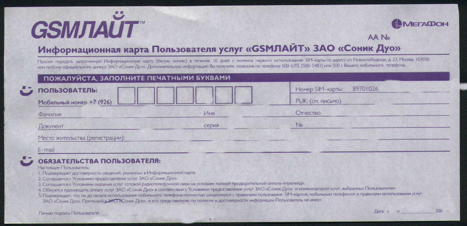 А именно: в течении 10-ти дней с момента активации карты необходимо ветрнуть заполненный квиток либо в офис Мегафона либо любому авторизованному диллеру.