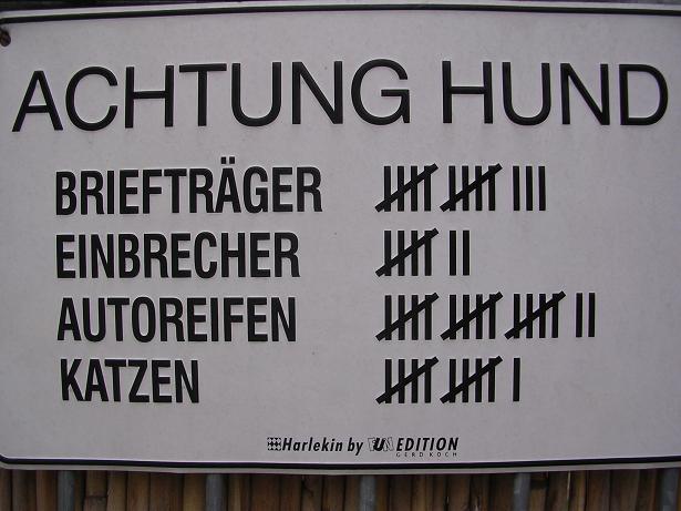 Ну "внимание, собака"- это понятно. А дальше идет статистика, сколько эта зубастая тварь съела несчастных почтальонов, воров, автомобильных покрышек и кошек!