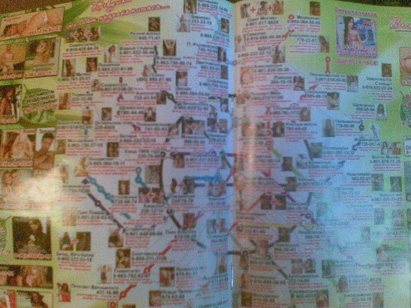 ВЫХожу седня из офиса в седьмом часу, сажусь в авто и плетусь по Орликову. Перед светофором дяденьки раздают какие то журналы... Ну все как всегда, никогда окно не открываю, а тут.... "Флирт и Знакомства"!!! 32 страницы формата А5 на хорошей бумаге телефонов проституток с фотками (естественно левыми)!!!! И по районам и по округам и на развороте даже карта метро с помеченными борделями!!! Так и хочется не домой поехать! А тут сити с нюшкой закрывают.... См фото