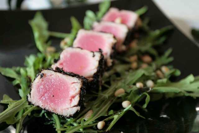 Тунец, обжаренный в чае, с рукколой. 2 порции Что нужно: 200 г тунца 2 ст. л. чая "Эрл грей" 2 горсти свежей рукколы 100 мл оливкового масла 1 ст. л. бальзамического уксуса 2 ст. л. кедровых орехов