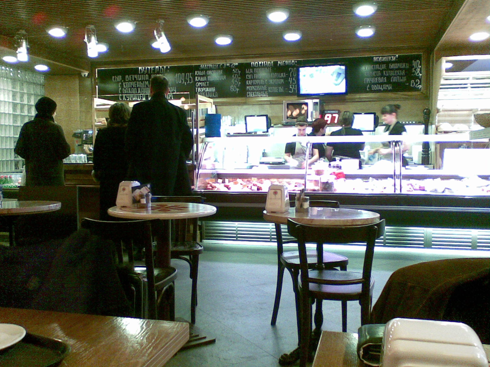 Из витрины надо выбрать нужную еду нужной порции, служащий её подготовит (разогреет или упакует), передаст на кассу..