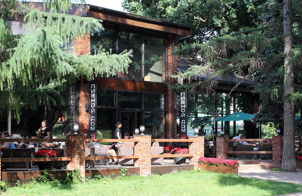 В кои веки (впервые за все время что живу в Москве ) оказался в Парке Горького. И случайно набрел на пивной ресторан. Если свернуть с Ленинского в районе 8-х домов, и углубиться в парк, как раз будет заход на Андреевский пешеходный мост и рестик где то там. Привлекла прежде всего зачетная летняя веранда. Внутри интерьеры тоже очень даже. Вот только больше ресторану подходят чем пивному кабаку. Сидели понятно дело на веранде. Хорошие столики в тени хвойных деревьев, обстановка можно сказать романтическая ... Пиво там отменное! И стоит вменяемых денег Шофферхоффер нефильтрованный 250р за 0.5, темный ирландский Харас 280р за 0.5, Гролш 260р. за 0.5. Со жрачкой хуже. Дорогая и выбор не сказать что богатый. Взяли креветок к пиву. Креветки зачет, с укропом причем (хз зачем), но 600р  2 шпажки бараньего кебаба 600р , несколько ложек риса на гарнир - 200р Свиные ребра - 1тр. Овощи на гриле на гарнир -300р (там реально есть было нечего в этом гарнире) Со жратвой и пивом получилось 4.5тр на двоих Вайфай имеется, хотя кредитки не принимают, тольк налик. Толчок тоже зачет. 4 отдельные кабинки каждая со своим рукомойником.