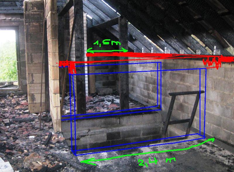 убедили делать крышу двухскатную. Пользуясь случаем хочу спросить- что переделать на крыше . Так как было проблема с отсутствием единого бетонного кольца( а были лишь бетонные полосы под муралетами на продольных стенах), то думаю разобрать часть кладки сводов и залить сверху новое кольцо схватывающие поперечные стены по 1,5 -1,7 метра(до окон мансарды - на фото планируемое новое бетонное кольцо красным цветом)и сделать на мансарде поперечнные перегородки примерно по 2,4 метра(на фото синим цветом), которые также схватить для крепости тем же самым новым железнобетонным кольцом. Приезжали две бригады. Одна бригада согласны с моим планом, другая грит, что не стоит ипатся с новым кольцом,чтооно ничего не даст, а лучше сделать подпорные столбики под каждым стропилом.