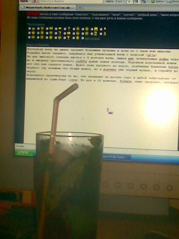 Поскольку мяту на рынке продают большими пучками и пока ее с чаем всю выпьешь большая часть завянет, задумался над утилизацией мяты с пользой  На дно высокого стакана листья с 4 веточек мяты, выжал дые четвертушки лайма туда же и высыпал тростникового саХЕРа думаю ложки полторы. Черенком деревянной ложки все это как следует помял. Далее льда крупного до верху, полтинник Капитана Блэка черного (ну понимаю что белый нужен, но в дьютике уже черный купил), и спрайту до верху. Получилось практически то же, что наливают по десять евро в любой забегаловке от шашлычной до суши-бара Но раз в 10 дешевле. Вобщем, ваше здоровье, господа!