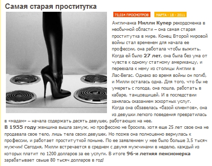 Ага.. а бесплатную путёвку на Фукусиму вы не котите ? У нас блага капитализма, только для тех кто у кормушки..остальные ..сами за себя..сколько заработала за всю жизнь,столько и получишь. И то не факт, опять дефолт придумают ..очередной.. **** Иду как-то по улице и чуствую какими-то бабкиными саками воняет..поднимаю голову..смотрю бабулька в норковой шубке со старой уже дочкой идёт ..ковыляет так еле ноги переставляет..и так что-то мне страшно стало и горько..что я тоже буду такой же посыпалкой песка.. А прочитала у Миланки пост и полезла в инет..и вот что нашла в гугл по слову "старая проститутка"... Занимательная история про 96 летнюю проститутку..
