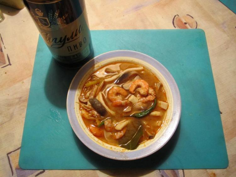 Насчет вкуснее и мягче спорить не буду, но насчет насыщеннее есть сомнения. Как может куриный бульон быть насыщенне бульона рыбного, да еще приготовленного из благородной рыбы? Я свой рецепт немного видоизменил. Листья и корешки подольше поварил, минут 20 (хотя час их варить это все равно черезчур), 5 минут пожалуй маловато будет. пасту успользовал уже на этот раз из желтой баночки. Вкус уже получился более похожий на оригинальный. Хотя все отличие желтой и красной пасты, как мне показалось только в том, что в желтой рыбного соуса явно больше. Хотя и и так его добавляю Еще если хотите что был прям ядреный как в тае, то одной пасты маловато будет, надо еще перчику добавить. Я так досыпал приправы, которую в этом же китайском магазине докупил. Думаю теперь все же надо попробывать на курином. Только в таком случае туда придется больше морепродуктов добавлять, а это уже более затратно.