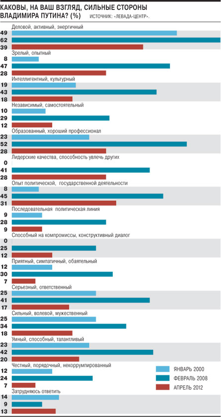 По рейтингам доверия президент Путин по-прежнему остается самым популярным политиком страны, как это фиксируют все ведущие социологические службы страны. Но устойчивые и "долгоиграющие" настроения общества социологи выявляют не через "лобовые" вопросы вроде "Кому из политиков доверяете?" или "За кого будете голосовать?" На такие вопросы каждый "лояльный человек всегда держит в голове "правильный" ответ", пояснил "Ъ" директор "Левада-центра" Лев Гудков. Есть вопросы, не касающиеся политики, отвечая на которые, респонденты не подбирают "правильных ответов". Один из таких вопросов: "Каковы, на ваш взгляд, сильные стороны Владимира Путина?" Его "Левада-центр" регулярно задает с 2000 года. В конце апреля 2012 года социологи выявили, что оценка почти всех "сильных сторон" господина Путина вернулась на первоначальный уровень 2000 года, испытав пик в 2008 году.