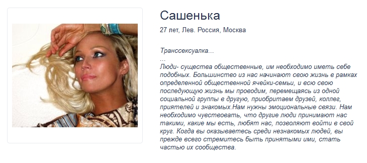 А в голове у неё вумные мысли...не знаю как в сексе...но с внутренним миром всё в порядке у трансвеститки Сашки....