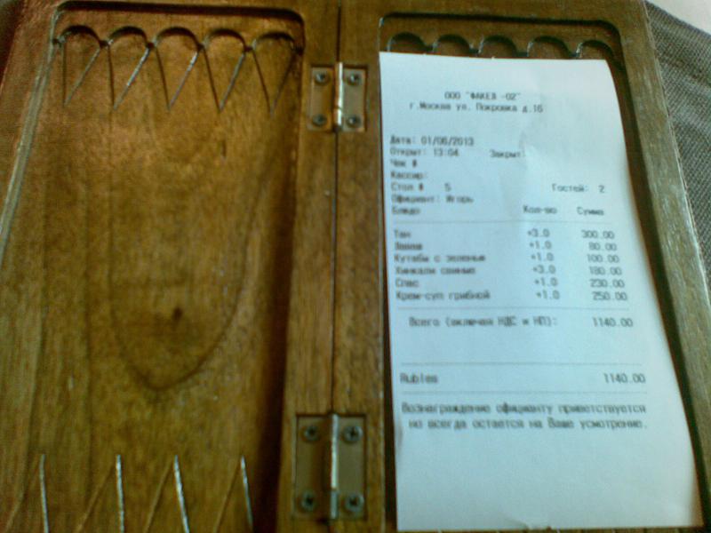 еда неплохо, но без восторга - салат с кюфтой: говяжий фарш, жареные баклажаны, капуста, салат - 3; - салат долма - 3; - кутабы (сырные, говяжьи) - 3; - хинкали - 4 (я как раз люблю тесто потолще); - авелуковый суп - 4 - неплохая штуковина; - пити - 5 (ахуенская вещь, знатоки в курсе); - жаренная кюфта тава - 4 (интересные лепешки из фарша, но съел только половинку одной); - долма телячья - 3 (сухая сильно); - долма барашковая - 4; - плов: баранина, каштаны и пр. - 4 (вкусный рис).
