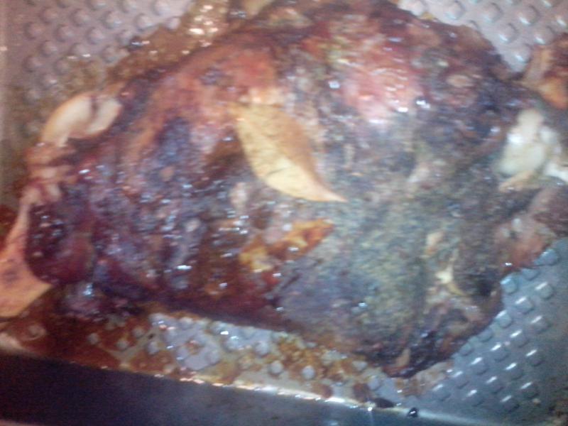 Ногу делал в рукаве. Нашпиговал чесноком, зубчиков 8, перец, соль, лаврушка. Больше никаких специй не добавлял. В рукав добавил 250 гр. воды. Сам рукав проколол в нескольких местах ножом. Все это в разогретую духовку 180-200 градусов на 3 часа.