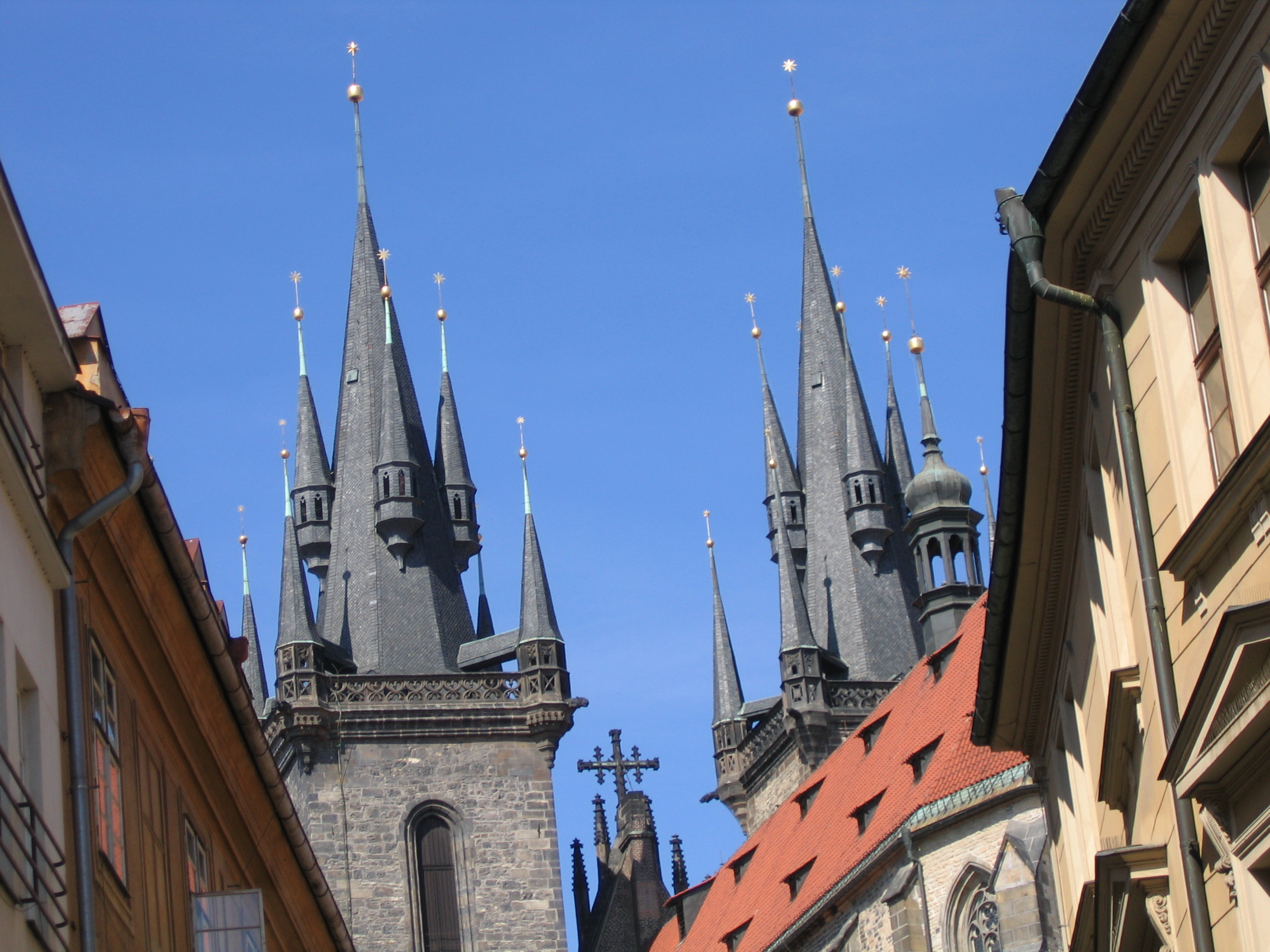При внимательном рассмотрении униформы этого господина, я быстро догадался, что он давно умер . Что он сделал такого, что чехи его увековечили, я забыл, но, видимо спас(сохранил, собрал, воссоединил и т.п.) великий чешский народ. Народ этого не забыл и, в благодарность обставил всю площадь магазинами (заходить не советую, т.к. все заслуживающее внимания там у нас дешевле), заведениями общепита и живописно разбросал киоски с хот-догами . Хот-догами торгуют, в основном хохлушки, которые по ТТХ не прошли ФЕЙс-контроль в Москве и воплотили свои фаллические мечты в этих скромных символах свободного мира. Так же много киосков печати(видимо чехи любят читать) . А, так как чешский народ дружелюбен, можно купить и газеты других стран, в т.ч. и российские. Спустившись вниз по бульвару и забравши чуть правее, сквозь живописные узкие улочки, напичканные всякими лавками для туристов, вы попадете на Староместскую площадь.