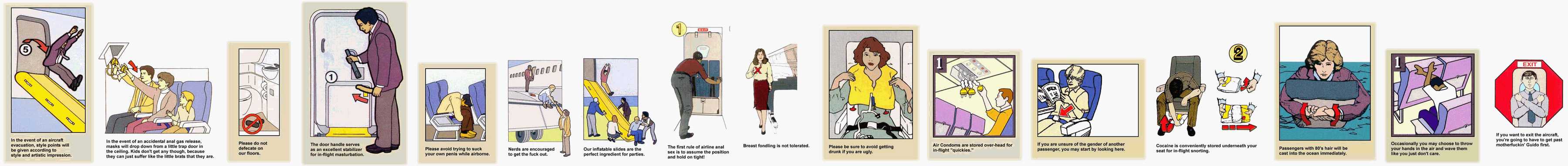 Перед взлётом воздушного судна бортпроводник, милая и симпатичная девушка, проводит инструктаж пассажиров: - Добрый день уважаемые дамы и господа! Разрешите поприветствовать вас на борту авиакомпании "...авиа". Пристегните, пожалуйста, ремни. Спинки кресел приведите в вертикальное положение. Потушите сигареты. Возьмите свои паспорта и вырвите из них первую, вторую и третью страницы. Сверните их в трубку и засуньте себе в задницы. Пассажиры возмущённо начинают спрашивать: - В чём дело! Что такое! Зачем нам нужно засовывать в задницы паспорта?! Бортпроводник: - Успокойтесь, пожалуйста. Это меры безопасности нашей авиакомпании. Недавно произошла авария воздушного судна авиакомпании "...авиа". Там так всё перемешалось и запуталось...