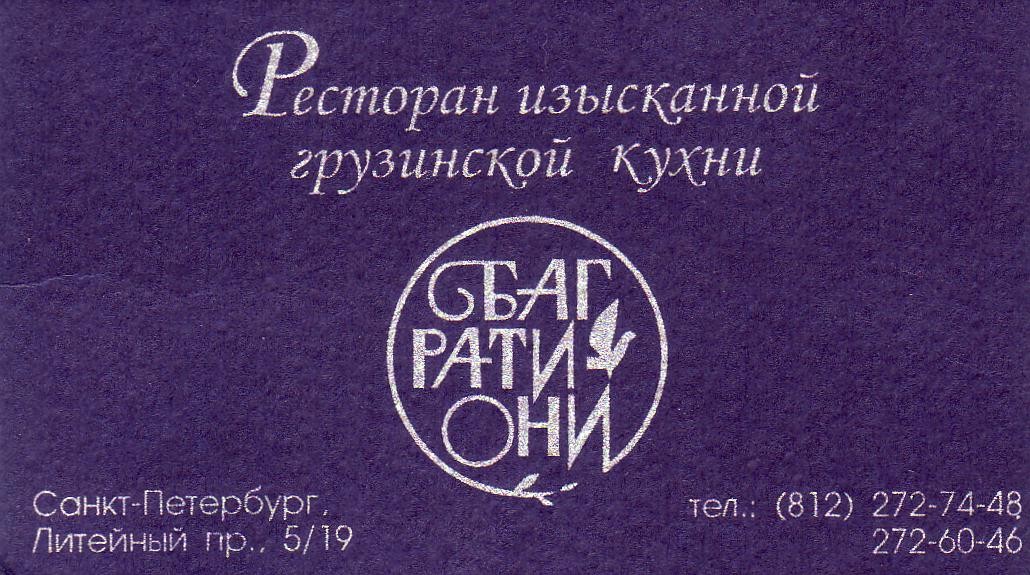 Виноват! Исправляюсь. Итак. Ресторан "Багратиони" в С-Петербурге. Тел.(812)272-7448. Литейный пр-т 5\19 (р-н метро "Чернышевская"). Время работы с 12-00 до 24-00. Живая музыка - с 20:00-23:00. Парковка. Прием кредитных карт. Действующий мангал в зале. Оформление интерьера я назвал бы, - Разумный модерн. Хотя фотографии мне не понравились, но примерно, это выглядит ТАК!