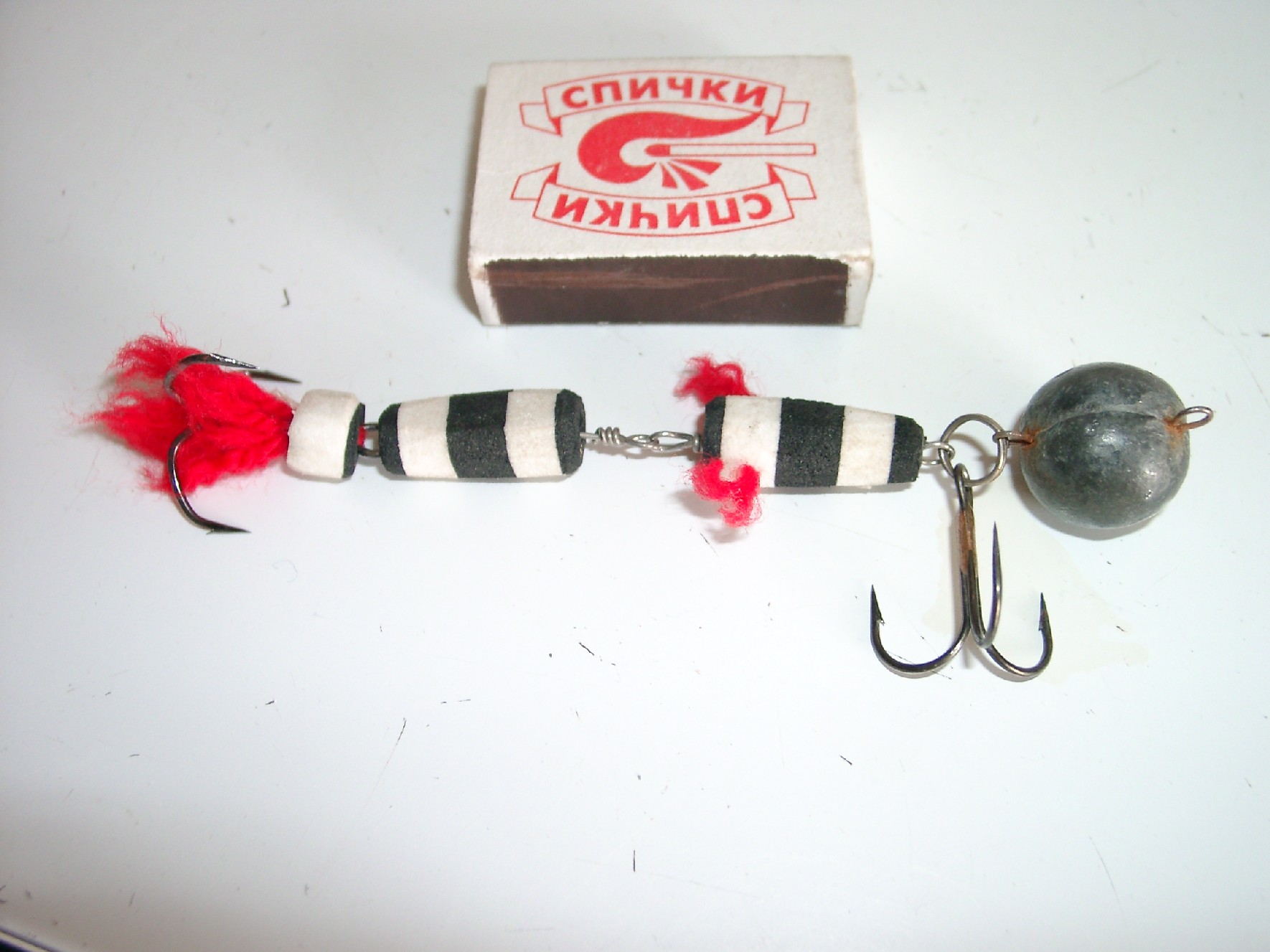 На первом приатаченном фото оснастка которая в простонародье называется «Мондула»(наверное в честь нашего Мондулаича названа). Это чисто судаковая оснастка вырезается из подошв вьетнамских разноцветных тапочек плюс красные шерстинки. Считается что она очень сильно раздражает судака и он без разбора бросается на нее. Верхний крючок для надежности зацепления. В позапрошлом году я на этот крючок случайно забагрил сазана на 8 кг. Спичечный коробок для сравнения размеров. После небольшой тренировки я научился собирать снасть за пол часа. Попробуйте, это не так трудно. Цвет не критичен поскольку на глубине рыба его не различает. Критичны ярко выраженные переходы (зебра).