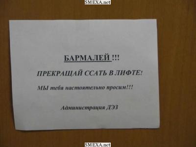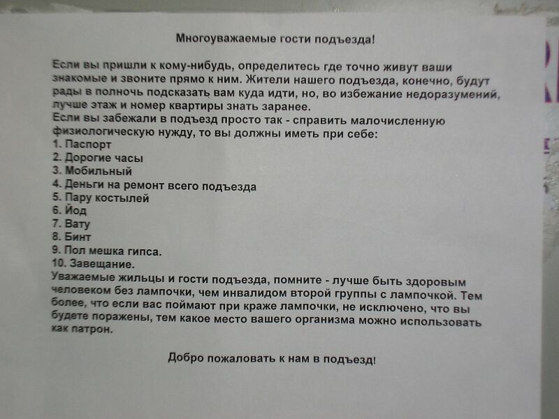 Многоуважаемые гости подъезда! Если вы пришли к кому-нибудь, определитесь где точно живут ваши знакомые и звоните прямо к ним. Жители нашего подъезда, конечно, будут рады в полночь подсказать вам куда идти, но, во избежание недоразумений, лучше этаж и номер квартиры знать заранее. Если вы забежали в подъезд просто так - справить малочисленную физиологическую нужду, то вы должны иметь при себе: 1. Паспорт 2. Дорогие часы 3. Мобильный 4. Деньги на ремонт всего подъезда 5. Пару костылей 6. Йод 7. Вату 8. Бинт 9. Пол мешка гипса. 10. Завещание. Уважаемые жильцы и гости подъезда, помните - лучше быть здоровым человеком без лампочки, чем инвалидом второй группы с лампочкой. Тем более, что если вас поймают при краже лампочки, не исключено, что вы будете поражены, тем какое место вашего организма можно использовать как патрон. Добро пожаловать к нам в подъезд!