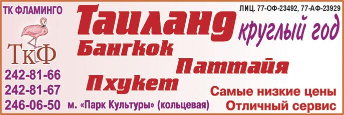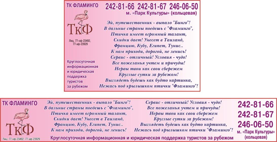 Эй, путешественник - выпало "Бинго"! В дальние страны поедешь с "Фламинго", Птичка имеет огромный талант, Скидки дает! Унесет в Таиланд, Францию, Кубу, Египет, Тунис..  К нам приходи, дорогой, не ленись! Сервис - отличный! Условия - чудо! Все пожеланья учтем и причуды! Нервы твои как свои сбережем Круглые сутки зарубежом! Выглядеть будешь как будто картинка, Нежась под крылышком птички "Фламинго"!