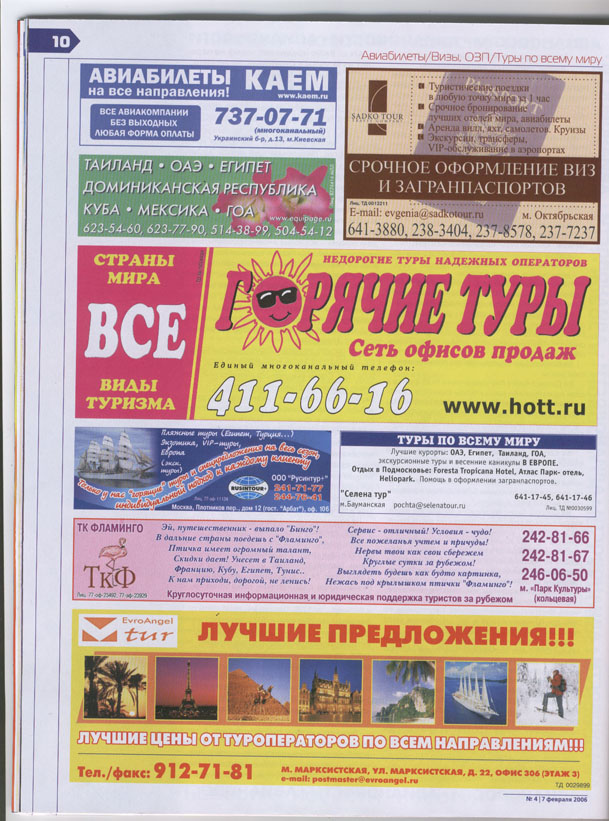Впереди летний сезон. Птички пришли к выводу - Фламинжаньи головы енто хорошо, но КЛСные запросто могут быть лучше А посему призываем пораскинуть мозгами светлыми и помочь нам придумать рекламные блоки для журналов. Вот образец объявления, которое нынче печатается в журнале "Туризм и Отдых". На сегодняшний день имеется необходимость придумать блоки размером 9 см в длину и 6 см в высоту по турам в следующие страны - Шри Ланка, Египет, Испания, Франция, Италия, Хорватия, Куба, Болгария, Чехия, Тунис. Приветствуются стишки или еще какие тексты. Обязательно упоминание о круглосуточной поддержке туриста за рубежом.