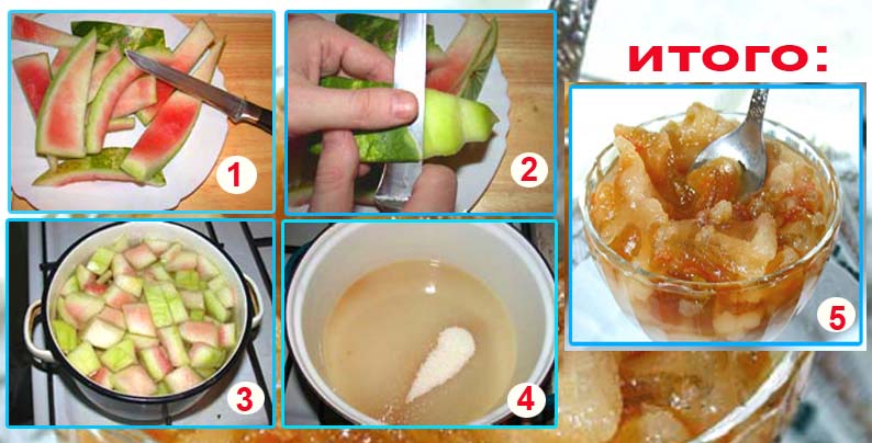 Вам потребуются: арбузные корки - 1 кг; сахар - 1.5 кг; вода - 500 мл; цедра лимона (или лимонный сок) - по вкусу 1-2. Арбузные корки очистить от верхней кожицы и отделить мякоть от белой корки. 3.Белую корку разрезать на кусочки размером 2-3 см. 3.Залить корки горячей водой и варить 5-10 минут, после чего откинуть на сито и охладить. 4. Сахар залить водой и, помешивая, довести до кипения. Когда сахар полностью раствориться, добавить цедру или лимонный сок. 5. Кусочки арбуза переложить в сироп и варить 20-30 минут, после чего снять с огня и оставить в сиропе на 2 - 3 часа. Затем повторить эту операцию, после чего снять с огня и оставить кусочки арбуза в сиропе на 2-3 часа. В третий раз варенье поставить на слабый огонь и варить до готовности - корки должны стать прозрачными. Варенье готово.