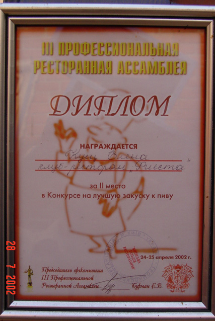 Будучи недавно в стольном граде Киеве, посетил одно из тамошних питейно-развлекательных заведений под названием "Фиеста", что возле Владимирского рынка. От диплома, висящего на стене просто обалдел!!! Слава Богу под рукой был фотоаппарат - удалочь запечатлеть:))). Киевлянам на заметку - ежли кто попробует - поделитесь впечатлениями:))). Вот только не возьму в толк - почему распределением наград в столь престижном соревновании занимается Профессиональная Ресторанная Ассамблея:))).