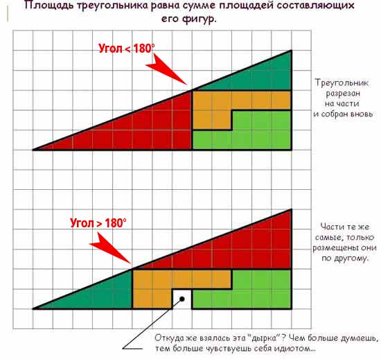 Просто диагональ на самом деле не прямая линия это можно определить следующим образом сравнить тангенсы углов треугольника тангенс красного = 3/8 = ,375 тангенс зеленого = 2/5 = 0,4. Поэтому то что мы принимаем за диагональ это на самом деле ломанная линия состоящая из 2-х элементов. В одном случае это дает +0,5 квадрата в другом -0,5 квадрата. Вот и все. Если хотите посчитайте площади всех фигур и якобы треугольника который из них составлен.