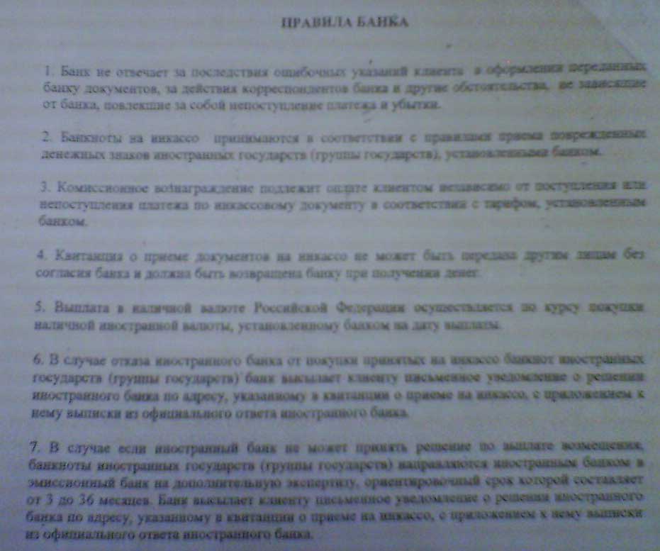 М-дя, вот только тут фишка такая. Денюжка один хрен будет направлена в некий иностранный банк, который таки может отказаться её принять (это оговорено условиями договора по счёту инкассо). Кстати, комиссия за сдачу на инкассо при этом не возвращается. Или назначить дополнительную эКСпертизу, которая может ориетировочно продлиться от 3 до 36 месяцев (так написано в договоре). Короче, см. Правила банка в аттаче.