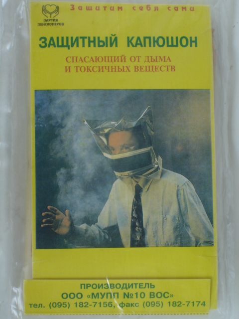 Из индивидуальных средств спасения вряд ли кто-то будет таскать с собой противогаз, хотя в армии на пожаре он помог и мне и моим друзьям. Однако есть индивидуальный защитный капюшон - маленький такой пакетик (в аттаче), позволяющий 10 минут находиться в задымлённой зоне, а 10 минут это ваш шанс выбраться и выжить. Я постоянно ношу в сумке такой пакетик, он лёгкий и места совсем не занимает. Стоит такой капюшон копейки и нашим блин правителям, чем всякой хренью заниматься, не плохо было бы раздать бесплатно каждому жителю России по такому, сколько бы жизней было спасено.