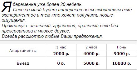 Соблазнился на фотографии. На телефоне оператор. Хата – четырехкомнатный притон. Встречает сама, волосы темные, на фотографиях говорит в парике. Действительно беременна, но пузо еще не большое, когда лежит на спине его не видно. Вес реально ок. 75 кг., рост ок. 172 см., ок. 30 лет. Тело изрядно потрепанное. За ШГ доплата, оператор объявляет 1 тыс. руб., фея 1,5 тыс. руб. МБР не практикует. Хата средняя, ванна убитая, атмосфера прокуреная. По действию очень ленива, цифирет, хамит, межпалочный трем отсутствует, т.е. занимается не своим делом. И самое печальное, что фотографии левые: в реале у девушки другая фигура-среднегоблинская, родинка на верхней губе, татуировка на лопатке – бабочка и тигренок в областе паха слева, чего нет на фотографиях. Рекоммендации: обходить стороной.