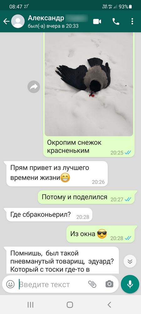 Хотя пострелять тоже люблю Например, в отсутствие охотничьего сезона вполне можно охотится даже в городе, притом не вставая из кресла в своем кабинете Это так называемый на вашем корявом языке (и очень популярный на североамериканском континенте) "кроухантинг", то есть охота на ворон  Конечно, из дробовика или винтовки в городе не постреляешь , но можно взять мощную и абсолютно бесшумную пневматику Ранним утром тихого, безветренного зимнего дня размещаешь ее на подоконнике, наливаешь большую чашку крепкого чая и начинаешь охоту  Самое сложное здесь - дождаться первую ворону и удачно подстрелить ее. Так, чтобы она упала на видное место, желательно - на крышу соседнего дома. А высший пилотаж - не убить, а лишь подстрелить ее. Например, перебить крыло. Чтобы она билась на крыше и громко орала. Тогда уже спустя несколько минут прилетит целая стая каркуш, которые с громким граем будут кружить над телом товарки. Но периодически кто-то из них будет садиться на провода или деревья. И здесь нужно не мешкать, а быстро и точно стрелять. Притом уже с противоположным результатом - бить каркушу нужно чисто, насмерть, и желательно чтобы труп исчезал из поля зрения - падал в снег или кусты. Тогда "отряд не замечает потери бойца" и круговерть смерти продолжается Но рано или поздно каркуши просекают, что происходит, стая дружно поднимается и уходит Остается лишь добить первую жертву, чтобы не мучалась. Результатом охоты является количество каркуш в "серии", которое, в отличии от рогов, на стену не повесишь, но можно похвастаться друзьям или на профильных сайтах Поганые пиндосы с огнестрелом делают серии в несколько сотен каркуш такие же результаты в свое время показывал Святой царь-мученик Николай Александрович Романов Мой рекорд - серия всего лишь из 11 каркуш