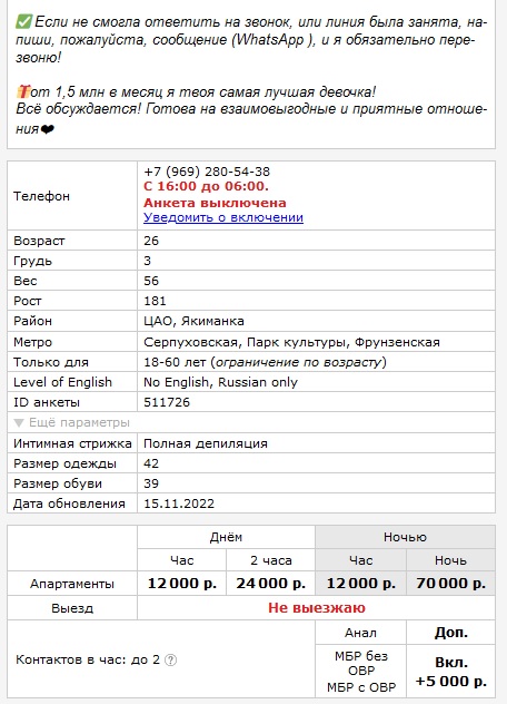 Доп описание: Фото/ТТХ полное соответствие, грудь своя красивая трёшка. Говорила что похудела на 5кг, а так у неё 4-ка Талия реально осиная, такое бывает после удаления нижнего ряда рёбер (был пару лет назад у одной такой порноактрисы), но у сабжа вроде всё на месте. Губы? -они разгубастились Не целуется! Проблема с кожей на лбу (шершавопупыристая)+морщина уже проглядывает и это в 26(!) лет В какой-то момент показалась похожей на Екатерину Варнаву в молодости, тоже из Сочи, но у той шнобель, а у этой прогиб в др сторону, но носяра присутствует. Поведение/воспитание: Никакая она не эскортница и не Модель. Поведение дворовое, вытягивает только за счёт ТТХ (рост). В анкете понаписала про эскорт от 1 млн/мес, сопровождение на мероприятия и т.д Рискните -будет ЗАШКВАР на первых же минутах