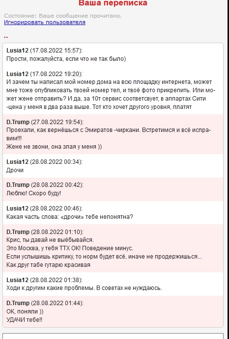 Трамп. Ну а что здесь такого? Девушка она красивая, высокая и модельная.. какой нибудь "богатенький буратино" может и возьмёт её на содержание на месяц, другой.. Мне по фото она очень понравилась, но у меня нет 1,5 ляма.. хотел с ней встретиться на часик.. Звонил, после твоего отчёта (прайс был 10к).. дозвонился сразу, душевно пообщались.. сказал ей, что "мы люди не местные, могу встретиться только в воскресенье утром до 12ч". Сказал, что "влюбился и ночью не могу уснуть, думаю только о ней" А она говорит: "я не встречаюсь так рано", видимо любит поспать в воскресенье.. Вот такая печалька.. Ты хоть счастливчик поимел её..
