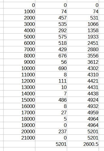 Всего анкет от 0 до 21999 (премиум влом считать) вышло 5201, значит на сумму от нуля до между 6000 - 7999 приходится ровно половина анкет, а вторая половина находится между 6000 - 7999 и до 219999. Медиана если по-грамотному.