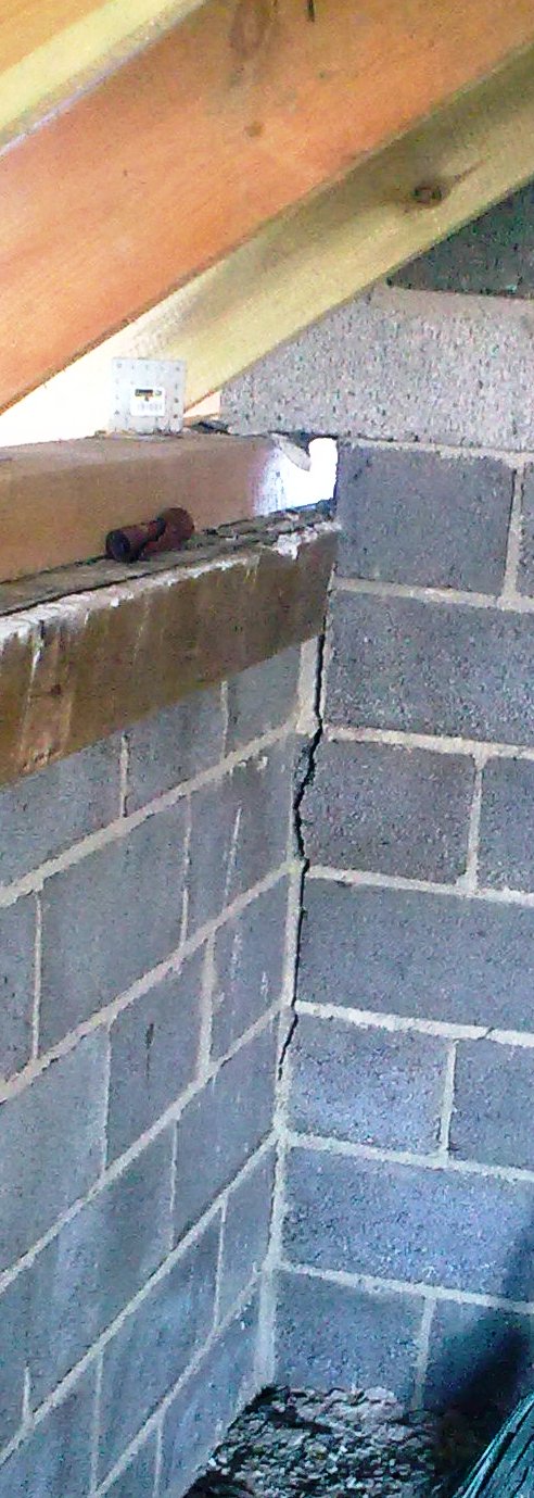 треснула стена, вернее угол стыка капитальных стен. Имхо причина в слишком тяжелой черепично-бетонной крыше. Крыша от тяжести распирает нижние концы стропил наружу,а стропила тянут за собой стену.