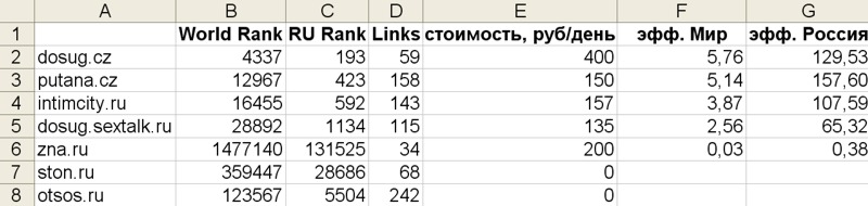 Думал-думал, где разместить эту тему, решил в форуме фей, поскольку она для них, наверное, наиболее интересна. А то вечно пишут, "Где давать рекламу?". Не претендуя на истинность, сделаем вполне обоснованное предположение, что чем более досуговый сайт посещается, тем лучше на нем работает реклама. Проблема только в том, что цифры посещаемости досуговых сайтов найти трудно, поскольку счетчики они не размещают, данные не публикуют. Поэтому воспользуемся сайтом анализа траффика alexa.com, который ранжирует сайты по траффику с др. сайтов. Недостаток этого подхода в том, что не учитываются прямые заходы на сайт, но все же это лучше, чем совсем ничего. Итак, строим таблицу (у кого в браузере она "съехала" см. приложение): 1-я колонка - мировой рейтинг (место) сайта по alexa.com: чем он ниже, тем сайт более посещаем. К примеру, google.com имеет рейтинг 1, а yandex.ru - 26. 2-я колонка - российский рейтинг сайта. Тут yandex.ru первый, очевидно. 3-я колонка - колв-о сайтов, кот. ссылаются на данный сайт. Чем цифра больше, тем лучше. 4-я колонка - стоимость дня. Пояснения: intimcity.ru - для досуговых проверенных фото, если у вас 3-4 анкеты; putana.cz - 3 единицы, что гарантирует размещение анкеты на 1-3 стр. 5-я колонка - эффективность размещения рекламы, мировая1/ (1-я * 4-я)*100000, просто некий балл. 6-я колонка - тоже самое по России. Сразу некоторые пояснения. Все сайты, не входящие в первую тройку - dosug/intimcity/putana, имеют настолько низкие рейтинги, что их просто можно игнорировать. Вообще, они бесплатные, так что рекламу можно размещать, если время есть. Рейтинг dosug.sextalk.ru = sextalk.ru, то есть траффик не разделяется. Однако для рекламодателям надо иметь ввиду, что далеко не все посетители sextalk.ru заглядывают на dosug.sextak.ru. Особняком стоит zna.ru, который до сих пор хочет 6000 руб за месяц, при этом имеет популярность ниже бесплатных сайтов. Вывод однозначный. Видим, что лучшее вложение - dosug.cz. Близко к нему - putana.cz, причем по российскому рейтингу она даже его обгоняет. dosug.sextalk.ru неплох, но, повторю, если только предположить, что ВСЕ посетители sextalk.ru туда заглядывают. Если отвлечься от цифр и обратиться к практике, то ощущения такие: выгоднее всего давать реклама на "нюшке", если денег мало - на intimcity. Pitana.cz интересна, но не настолько, чтобы там давать рекламу. Кстати, коррелирует с моей статьей